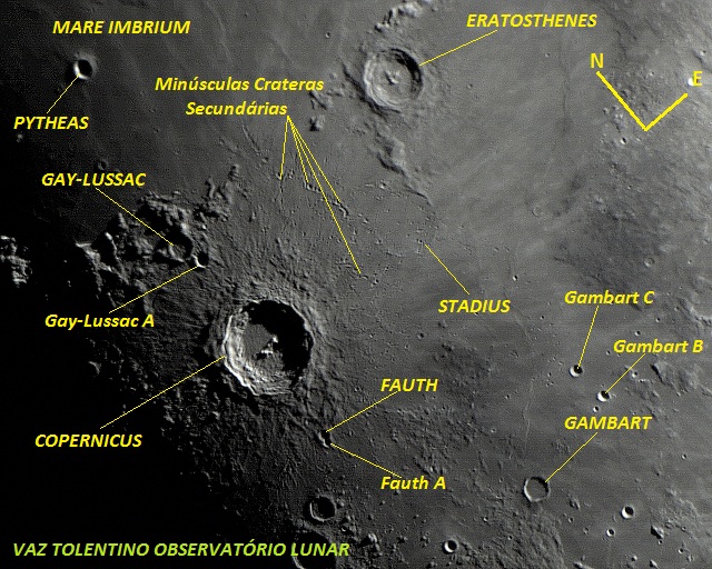 Note também, a cadeia ou seqüência de minúsculas crateras secundárias situadas a nordeste e noroeste de Copernicus (múltiplos pontos em seqüência sinuosa na foto), criadas pelas batidas dos escombros lançados para fora no momento da formação da grande cratera.