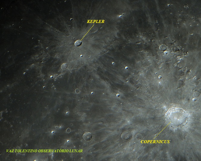 Note também, a cadeia ou seqüência de minúsculas crateras secundárias situadas a nordeste e noroeste de Copernicus (múltiplos pontos em seqüência sinuosa na foto), criadas pelas batidas dos escombros lançados para fora no momento da formação da grande cratera.