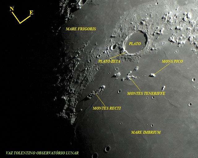 Ao sul de Plato e ao norte do Mare Imbrium existe uma solitária e destacada montanha, que emerge da lava do Mare Imbrium, conhecida como Mons Pico (2,4 Km de altitude, Lat: 45.7º N Long: 8.9º W). Possui 25 Km de comprimento, largura máxima de 15 Km, 2,4 Km de altitude e assenta-se no sentido noroeste-sudoeste. Observe nessa foto, a grande e destacada sombra criada por Mos Pico devido à posição obliqua da luz do Sol.
