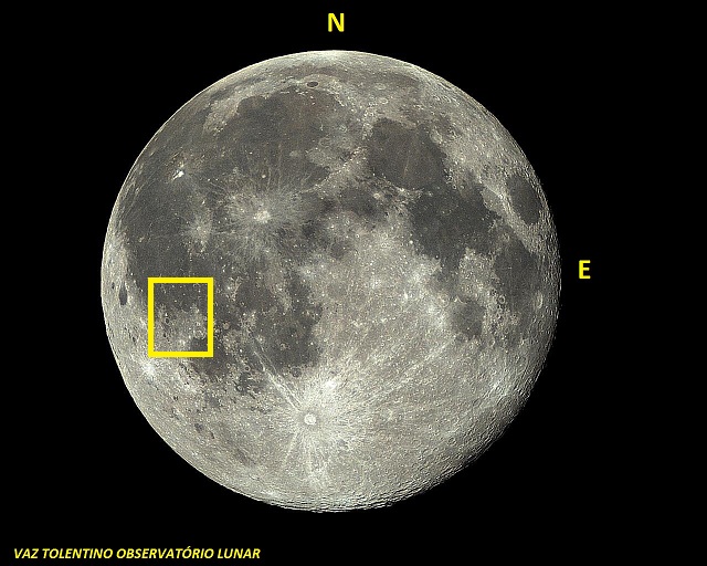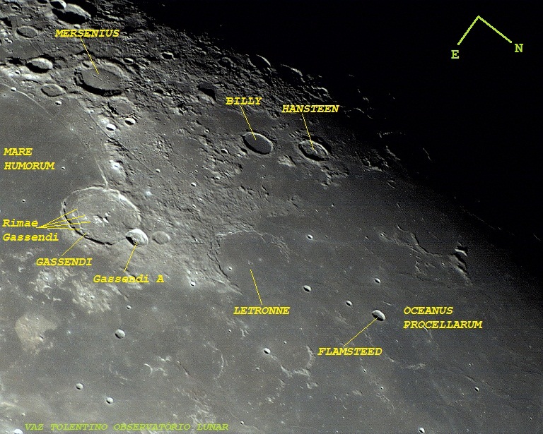 Gassendi: Cratera (diâmetro: 110 Km (69 milhas), profundidade: 1,9 Km, Lat: 17.6º S Long: 40.1º W).