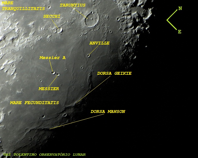 Cratera Messier A  - Dimensões: 13 Km X 11 Km. Profundidade: 1.5 Km. Coordenadas -  Lat: 2.0o S, Long: 46.8o E