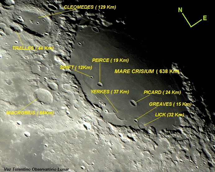MARE CRISIUM– diâmetro: 638 Km. Lat: 17.0 º N  Long: 59.1º E.