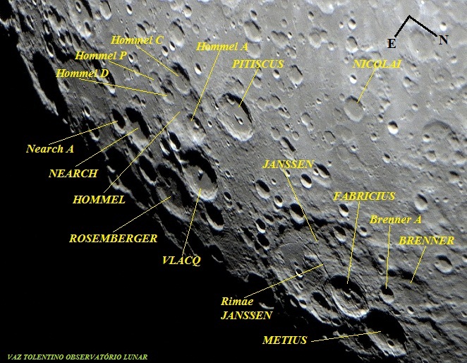 Mais abaixo, do lado sudoeste de Janssen encontra-se a proeminente cratera de impacto Vlacq (diâmetro: 89Km (56 milhas), Lat: 53.3º S Long: 38.8º E). É uma cratera de formação circular com paredes altas e inclinadas, em forma de degraus ou curvas de nível (terraced). Seu piso é plano (inundado por lava), com 3,0Km de profundidade, apresentando montanha central com 2 picos, originada na reação do piso ao impacto que a criou.