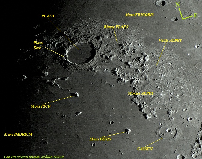 Observe também que, a leste de Plato, situa-se o Vallis Alpes (Lat: 48.5º N Long: 3.2º E), um espetacular vale lunar que divide a cordilheira conhecida como Montes Alpes em duas partes. Estende-se por 166 Km a partir da bacia do Mare Imbrium inclinando-se de leste para nordeste até as margens do Mare Frigoris. O vale é estreito nas duas extremidades e alcança no máximo 10 Km de largura na metade de sua extensão. A superfície interna do Vallis Alpes foi inundado por lava, o que proporcionou um aspecto plano e liso em sua extensão. A superfície interna é cortada ao longo do vale por uma estreitíssima depressão ou canal (rille), formando uma bisseção. Essa estreitíssima fenda é tida como um alvo desafio para observações telescópicas feitas da Terra.