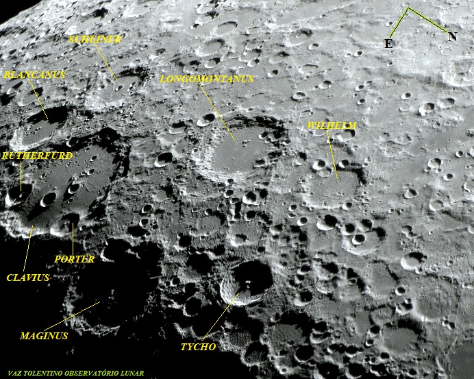LONGOMONTANUS– (diâmetro: 145 Km (91 milhas), profundidade: 4,5 Km, Lat: 49.5º S Long: 21.7º W).