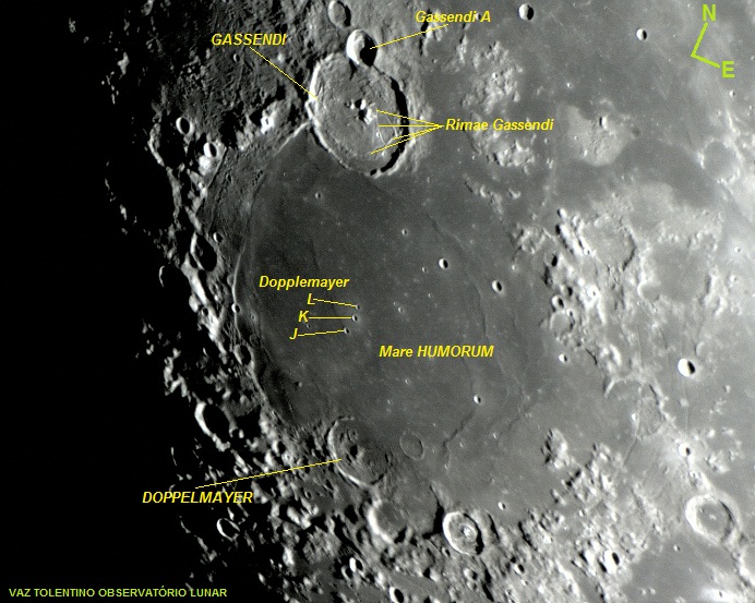 GASSENDI – Cratera com 110 Km (69 milhas) de diâmetro. Lat: 17.6º S Long: 40.1º W.