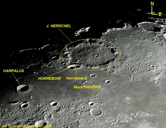 A borda sul de J HERSCHEL faz fronteira com o Mare FRIGORIS e, a borda sudoeste, faz fronteira com as crateras HORREBOW (26 Km) e Horrebow A (25 Km).