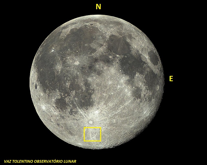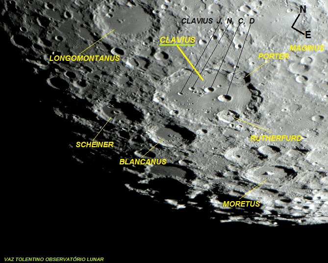 CLAVIUS– (diâmetro: 245 Km (153 milhas), Lat: 58.8º S Long: 14.1º W).