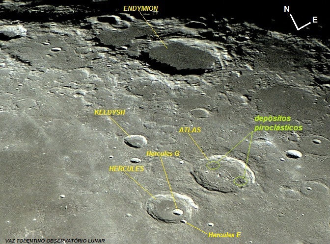 Atlas que tem 2 Km de profundidade, possui pequenas colinas situadas na região central de seu piso irregular, que é “fraturado” por um sistema de canais delgados em forma de “Y “, conhecido como Rimae Atlas, somando 60 km de comprimento. Supõe-se que a origem desses canais deveu-se às atividades vulcânicas, pois existem no interior da cratera duas manchas escuras (dark halo) indicando vulcanismo no passado. A noroeste de Atlas encontra-se a grande cratera Endymion (123 Km de diâmetro, Lat: 53.9º N Long: 57.0º E), com seu piso liso e escuro (baixo albedo), cheio de lava, com 2,6 Km de profundidade.