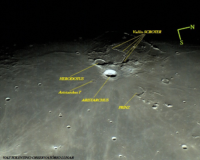 ARISTARCHUS – Cratera (diâmetro: 40 Km, Lat: 23.7º N Long: 47.4º W).