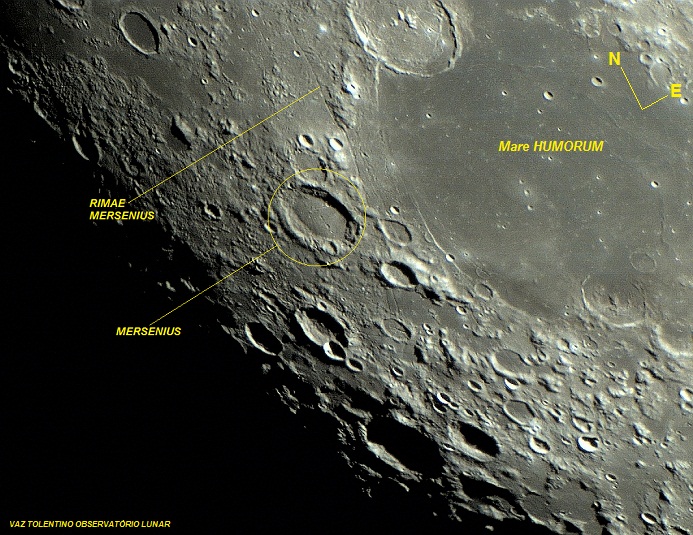 Rimae Mersenius: Depressão ou canal (extensão: 236 Km (148 milhas), Lat: 20.0º S, Long: 45.0º W).