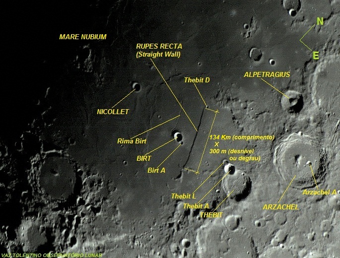 Do lado oeste de Rupes Recta existe a cratera Birt (Lat: 22.4º S Long: 8.5º W) com seus 16 Km de diâmetro. Sobre a parede leste de Birt, encontra-se a pequena cratera Birt A.