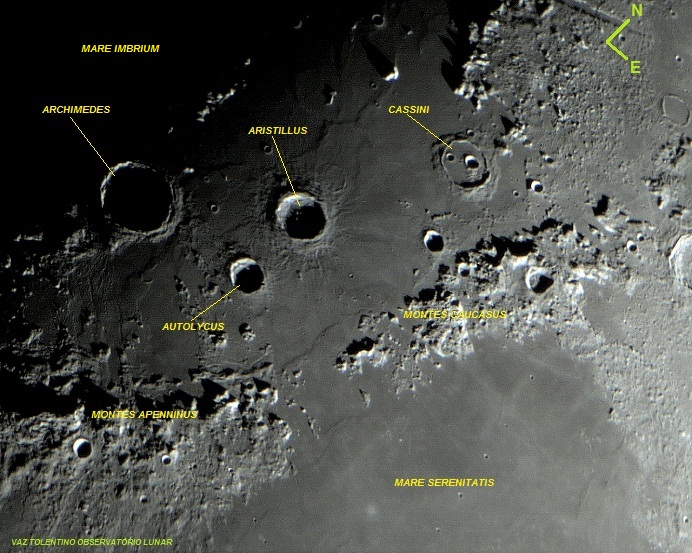 A nordeste de Archimedes encontra-se a cratera de impacto Aristillus (diâmetro: 56 Km, Lat: 33.9º N Long: 1.2º E), com suas paredes internas que desabaram e formaram degraus (walls in terraces) ou curvas de nível, piso interno plano, 3.6 Km de profundidade e 3 belas montanhas centrais com 900m de altura. As bordas externas que circundam a cratera formam uma espécie de “fortificação” com paredes escarpadas e inclinadas, criadas pelos escombros do impacto.
