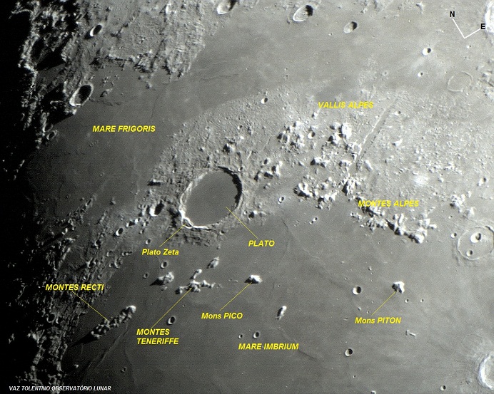 Observe também que, a leste de Plato, situa-se o Vallis Alpes (Lat: 48.5º N Long: 3.2º E), um espetacular vale lunar que divide a cordilheira conhecida como Montes Alpes em duas partes. Estende-se por 166 Km a partir da bacia do Mare Imbrium inclinando-se de leste para nordeste até as margens do Mare Frigoris. O vale é estreito nas duas extremidades e alcança no máximo 10 Km de largura na metade de sua extensão. A superfície interna do Vallis Alpes foi inundado por lava, o que proporcionou um aspecto plano e liso em sua extensão. A superfície interna é cortada ao longo do vale por uma estreitíssima depressão ou canal (rille), formando uma bisseção. Essa estreitíssima fenda é tida como um alvo desafio para observações telescópicas feitas da Terra.