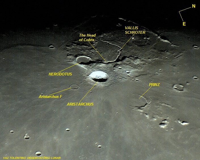 ARISTARCHUS – Cratera (diâmetro: 40 Km, Lat: 23.7º N  Long: 47.4º W).