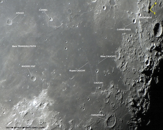 Rupes CAUCHY é uma falha tectônica ou escarpa, com formação linear, situada na parte leste do Mare Tranquillitatis, apresentando cerca de 120 Km de extensão, orientação na direção Noroeste-Sudoeste e cerca de 340m na parte mais alta de seu “degrau”.