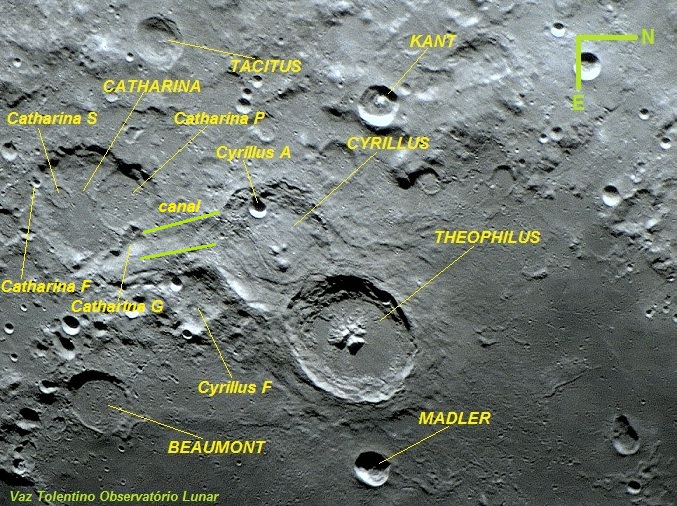A cratera do meio, Cyrillus, não é muito mais jovem. Note o aparente e enorme “canal” que conecta Cyrillus a Catharina. Na realidade, a conexão é o resultado da ação de muitos impactos, além de desmoronamentos.