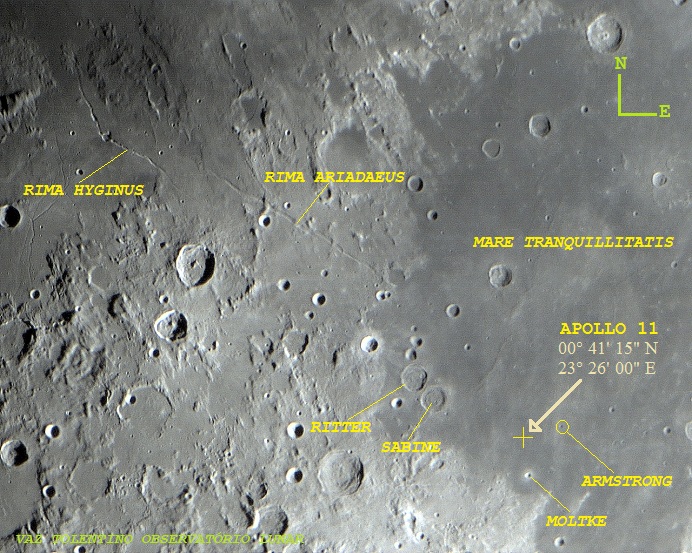 O primeiro pouso de uma nave tripulada na Lua aconteceu no dia 20 de julho de 1969, às 20:17:40 UT, quando o Modulo Lunar “Eagle” (águia) pousou no Mare Tranquillitatis, nas coordenadas Latitude: 00°41'15" N e Longitude: 23°26' 00" E.