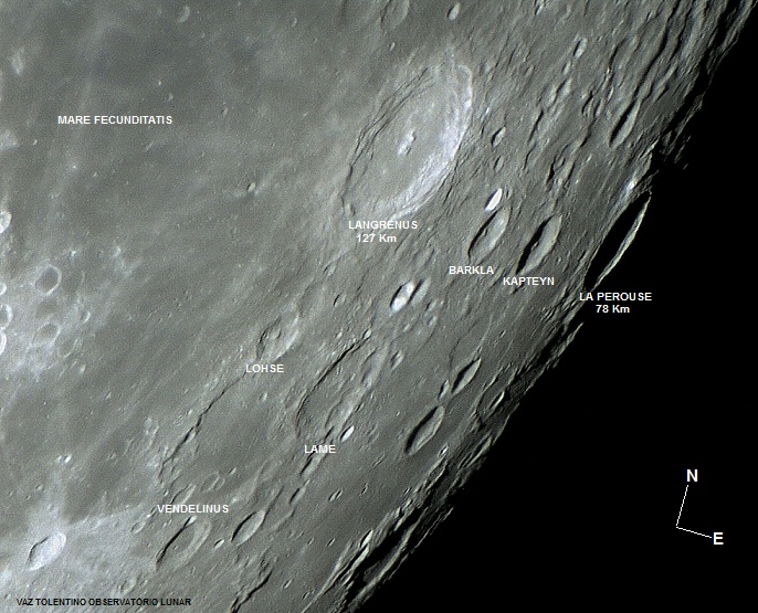 LANGRENUS - diâmetro: 132 Km, LAT: 8° 54′ 0″ S, LON: 60° 54′ 0″ E. Profundidade: 2,7 Km.