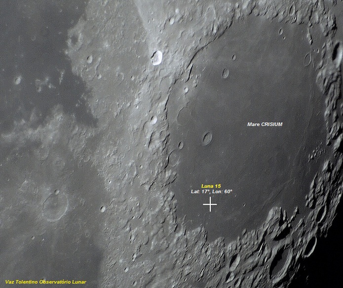Lançado à apenas três dias antes da missão Apollo 11, Luna 15 foi a terceira tentativa soviética de coletar amostras da superfície lunar e retornar para a Terra. Porém, por causa de uma pane do sistema direcional, a nave russa chocou-se com a superfície lunar em 17 de julho de 1969, às 15:50 UT. O impacto aconteceu no Mare CRISIUM nas coordenadas LAT: 17°00′00″ N, LON: 60°00′00″ E.