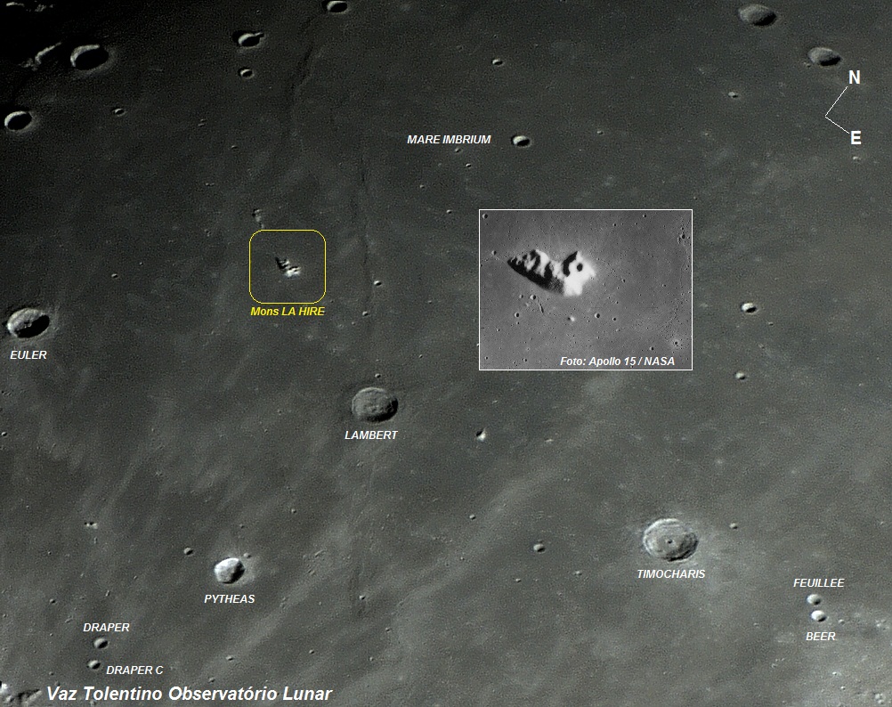 A imagem feita pelos tripulantes da Missão APOLLO 15, mostra que Mons LA HIRE hospeda duas pequenas crateras em seu corpo.