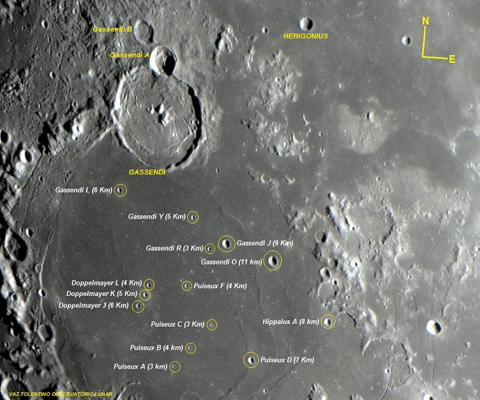 GASSENDI– Cratera (diâmetro: 110 Km (69 milhas), Lat: 17.6º S Long: 40.1º W).