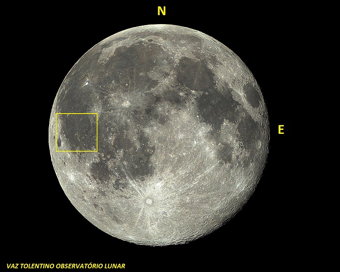 A cratera fantasma Flamsteed P (diâmetro 112 Km, LAT: 03.2º S; LON: 44.1º W) :