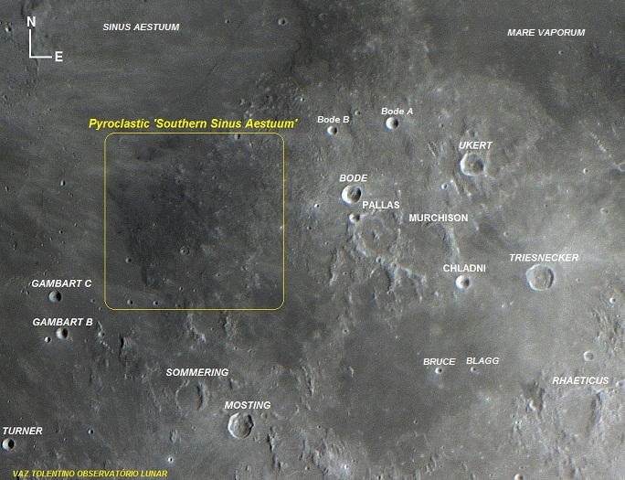 Pyroclastic 'Southern Sinus Aestuum' é um grande depósito de material piroclástico, com área aproximada de 30.000 Km2.