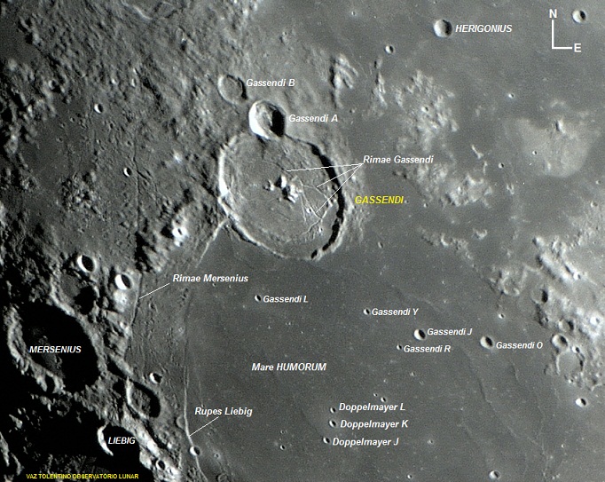 A grande cratera Gassendi está destacadamente localizada na margem norte do Mare Humorum e foi inundada por lava quando da formação do referido Mare. Por isso, somente a sua borda circular e os picos centrais sobressaem-se acima da superfície. Ao longo da borda de Gassendi, encontramos partes com alturas que variam de 200m a 2,5 Km acima da superfície. A superfície da cratera é cortado por um sistema de vários canais (rille), que dão um aspecto “fraturado” ao piso. Esse sistema de canais recebeu o nome de Rimae Gassendi. Os vários canais no piso da cratera são resultantes de forças vulcânicas e tectônicas. A soma dos comprimentos dos canais que fazem parte deste sistema, chega a atingir 155 Km.