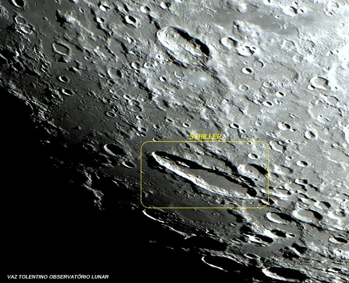 Rheita E lembra muito uma outra estranha cratera lunar chamada SCHILLER (Lat: 44.4o S Long: 54.6o W), que é bem maior que Rheita E, estando localizada no quadrante sudoeste da Lua. As dimensões de SCHILLER são 179 por 71 Km.