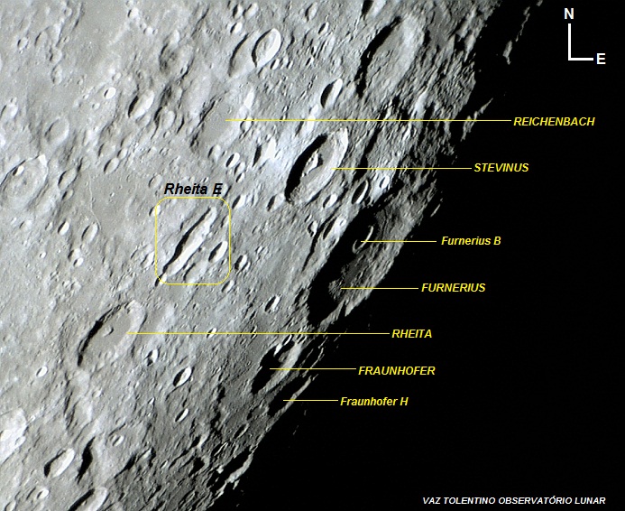 Uma das mais estranhas formações existentes na Lua é a longa e estreita cratera Rheita E. Localizada entre as crateras STEVINUS e RHEITA (de onde herdou seu nome). Em minha opinião, acho que ela parece com uma garrafa de coca-cola. Segundo o Dr. Chales A. Wood, parece com um “slot”.