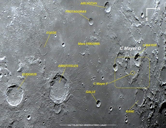 C. Mayer D (Lat: 62.1º N / Long: 18.6º E – Foto no Mapa LAC 13) é uma cratera de formato irregular, com diâmetro médio em torno de 66 Km, localizada no quadrante nordeste, perto do limbo norte da Lua.