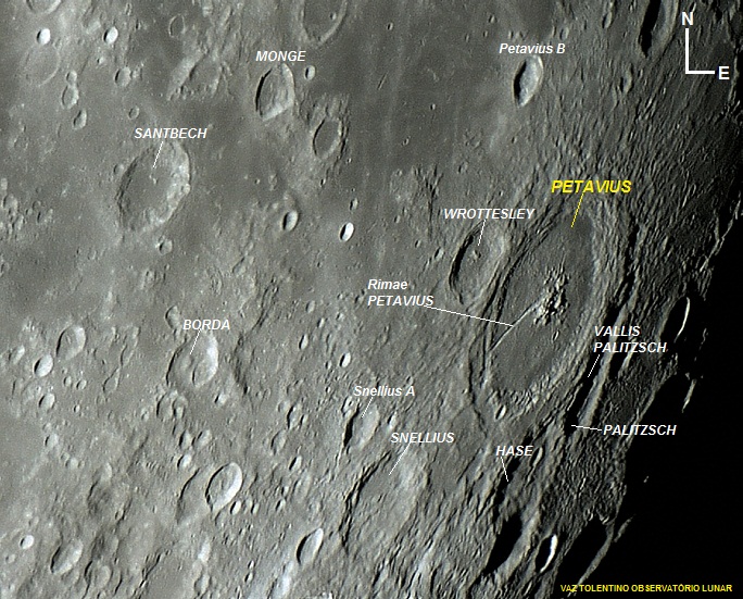 Externamente, perto da encosta sudeste de Petavius, existe uma formação alongada, formada pela junção alinhada de 3 crateras, criando um vale ou “calha”. Essa formação (que não aparece nesta foto) é conhecida como Vallis Palitzsch (extensão: 132 Km, Lat: 26.4º S Long: 64.3º E).