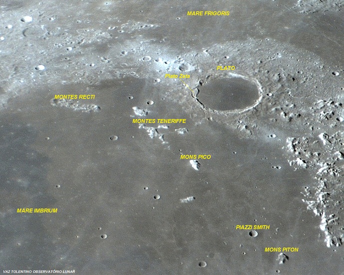 Observe que, na borda oeste da cratera Plato, é facilmente visto um grande bloco de material desprendido da beirada da cratera. O largo bloco de formato quase triangular é designado “Plato Zeta”. Ele desprendeu-se da parede da cratera e deslizou um pouco para baixo, fato esse confirmado pela projeção de sua sombra na fase “quarto minguante”.