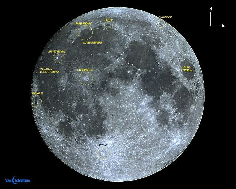 Fotos da Lua na fase cheia ou próximo dela, são boas oportunidades de se observar macro detalhes no disco lunar. Nas imagens acima podemos observar as tons diferentes de cinza dos mares de lava, os sistemas de raios brilhantes das crateras mais jovens e a rugosidade clara das terras altas.