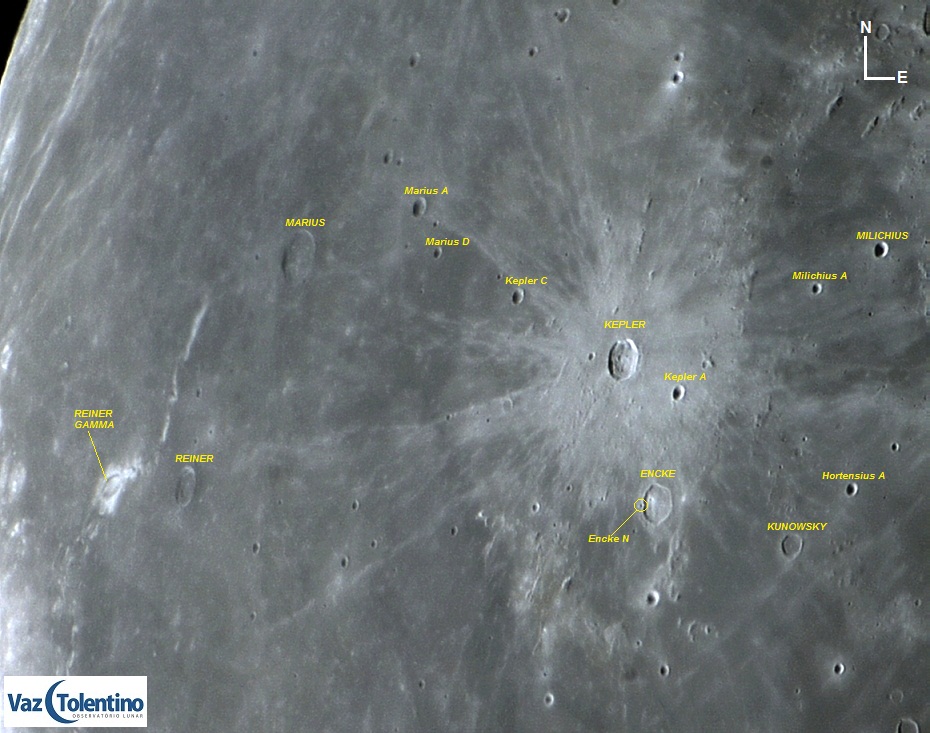 Ao sul de Kepler, figura a isolada cratera Encke (diâmetro: 28 Km, Lat: 4.6º N Long: 36.6º W). Suas paredes não são predominantemente redondas e sim com formato hexagonal. Seu piso raso (800mm de profundidade) é irregular e foi atravessado pelos escombros ejetados pelo impacto que escavou Kepler, o qual foi responsável pela criação do sistema de raios brilhantes. Isto indica que Encke é mais antiga que Kepler. A cratera Encke “hospeda” em sua borda oeste, a minúscula cratera Encke N (diâmetro: 4 Km), visível nessa foto.