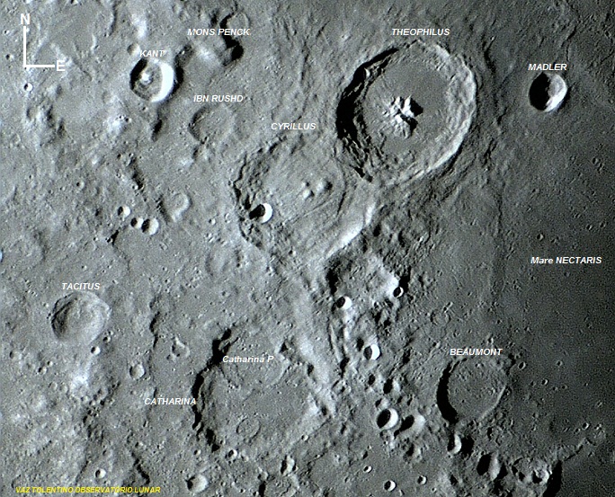 As crateras Theophilus, Cyrillus e Catharina formam um dos conjuntos mais impressionantes para a observação telescópica.
