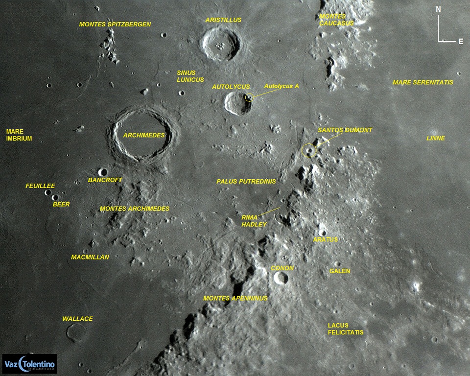 ARCHIMEDES– Cratera com 83 Km (52 milhas) de diâmetro. Lat: 29.7º N Long: 4.0 º W.