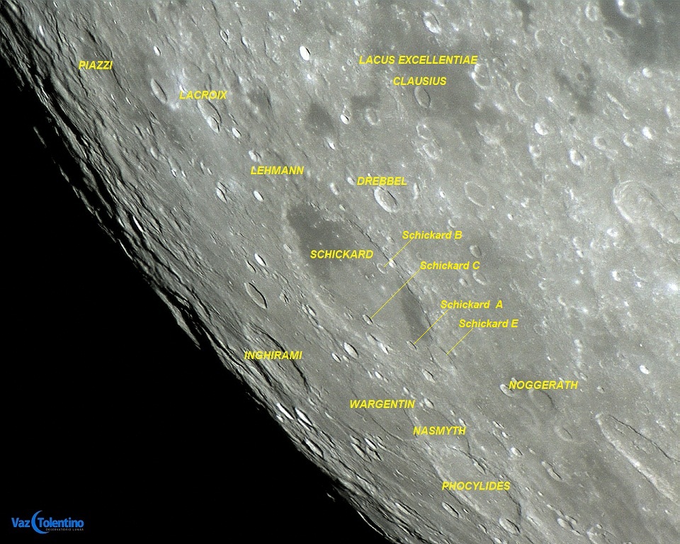 Schickard é uma enorme cratera de impacto, com 227 Km de diâmetro, localizada perto do limbo sudoeste da Lua. Por causa dessa localização, apesar de ser circular, parece ter formato de elipse a partir de nosso ponto de vista.