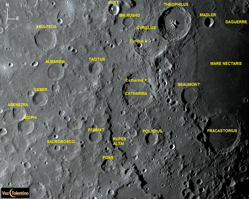 As crateras Theophilus, Cyrillus e Catharina formam um dos conjuntos mais impressionantes para a observação telescópica.