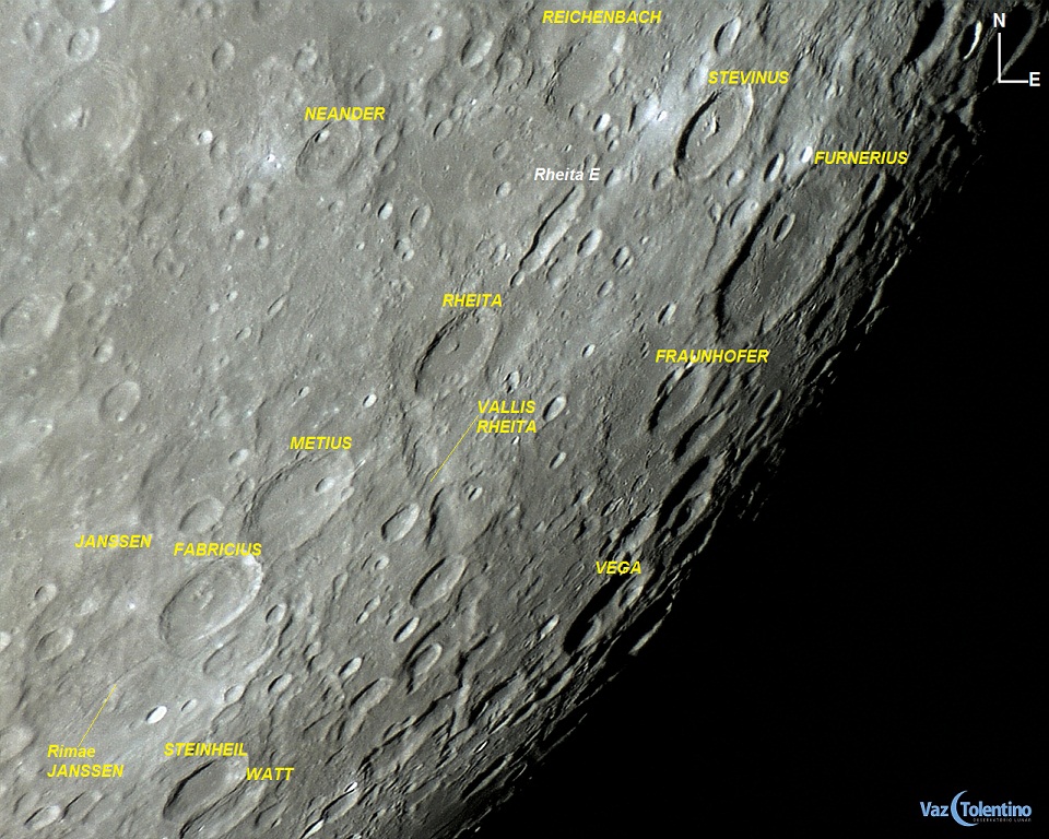 Uma das mais estranhas formações existentes na Lua é a longa e estreita cratera Rheita E. Localizada entre as crateras STEVINUS e RHEITA (de onde herdou seu nome). Em minha opinião, acho que ela parece com uma garrafa de coca-cola. Segundo o Dr. Chales A. Wood, parece com um “slot”.