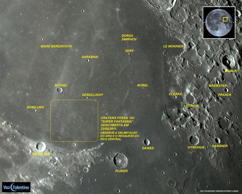 Saiba mais sobre essa cratera "superfantasma" ou cratera "fóssil", descoberta por Vaz Tolentino Observatório Lunar, no seguite endereço: