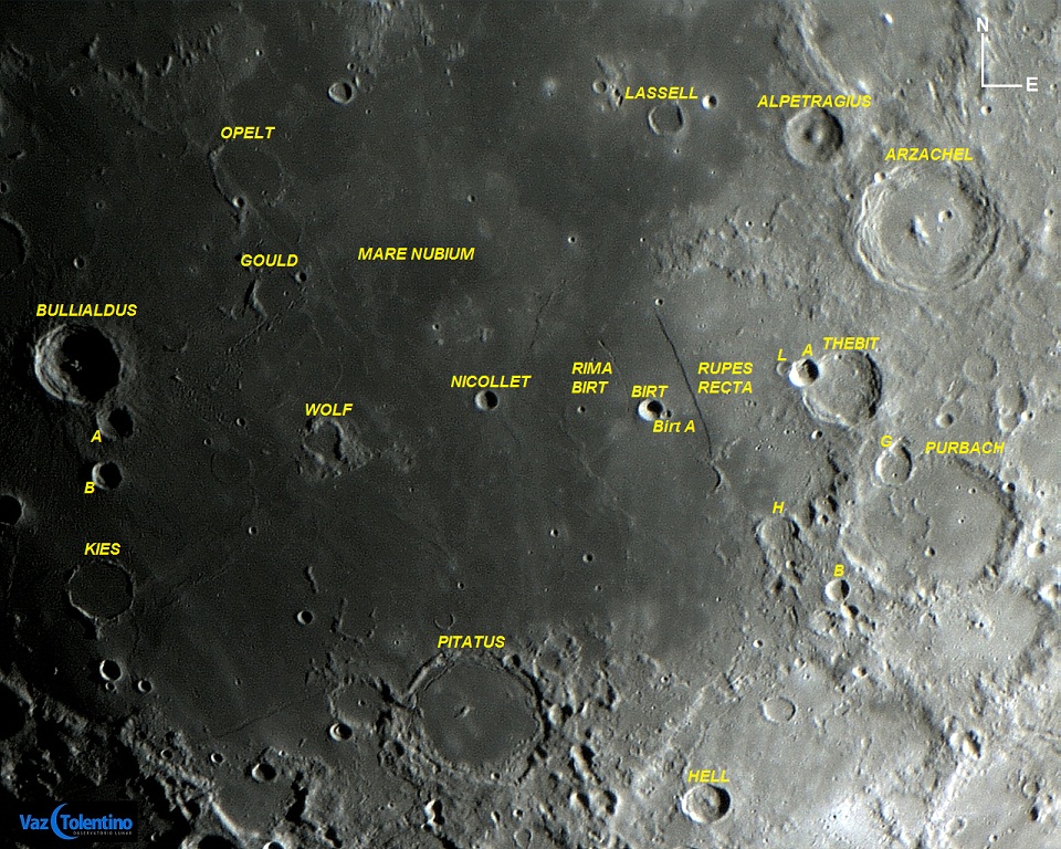 Do lado oeste de Rupes Recta existe a cratera Birt (Lat: 22.4º S Long: 8.5º W) com seus 16 Km de diâmetro. Sobre a parede leste de Birt, encontra-se a pequena cratera Birt A.