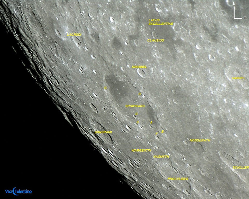 Schickard é uma enorme cratera de impacto, com 227 Km de diâmetro, localizada perto do limbo sudoeste da Lua. Por causa dessa localização, apesar de ser circular, parece ter formato de elipse a partir de nosso ponto de vista.
