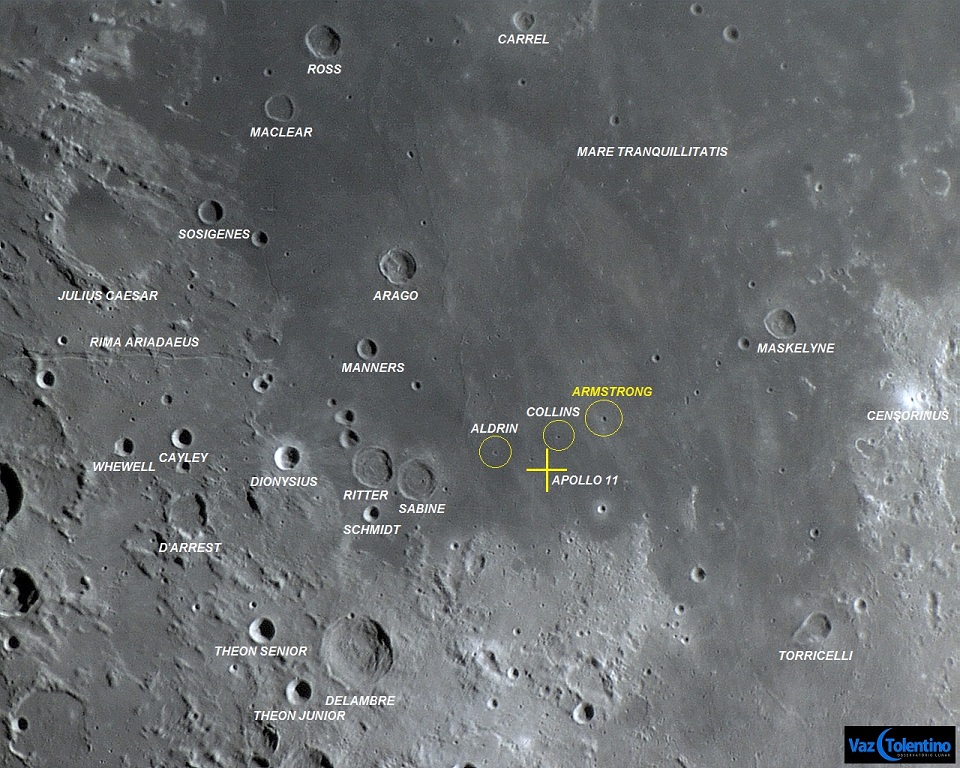 Foto: fotografia tirada pelo Vaz Tolentino Observatório Lunar, indicando o ponto de pouso do Modulo Lunar no "Mare Tranquillitatis" e as principais crateras vizinhas.