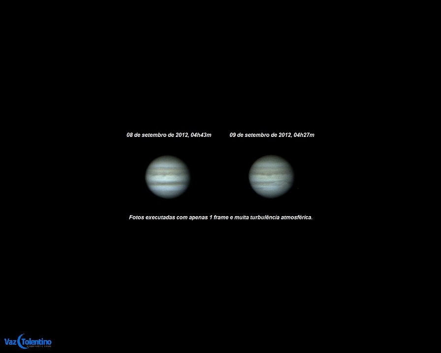 Foram capturadas imagens de Júpiter cerca de 24h de intervalo. As condições de turbulência e transparência não ajudaram na obtenção de boas fotos.