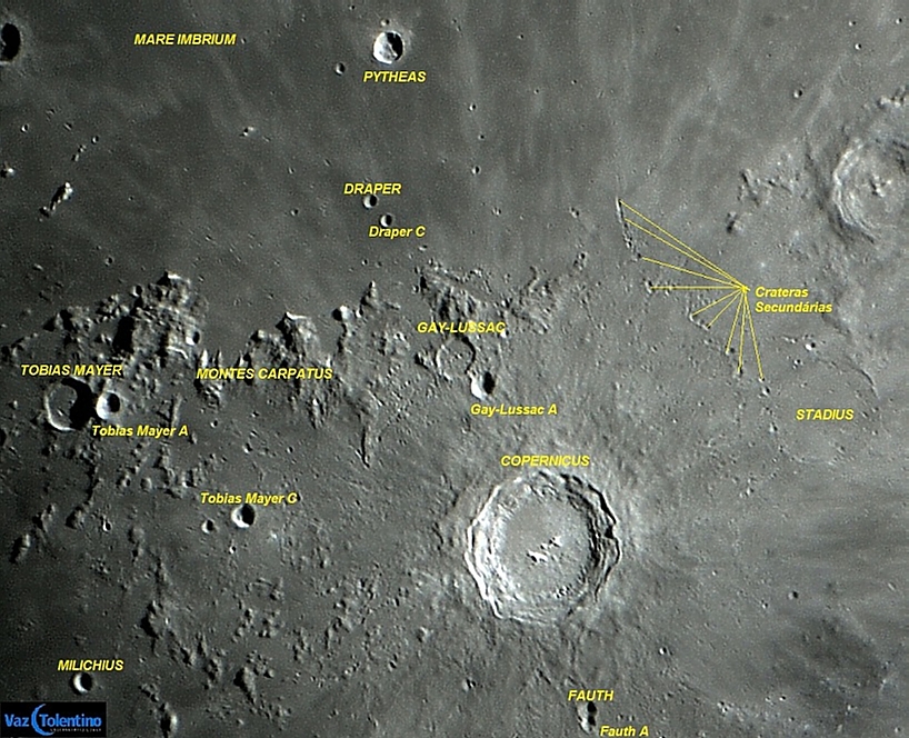 Note também, a cadeia ou seqüência de minúsculas crateras secundárias situadas a nordeste e noroeste de Copernicus (múltiplos pontos em seqüência sinuosa na foto), criadas pelas batidas dos escombros lançados para fora no momento da formação da grande cratera.