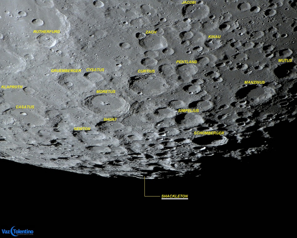 Shackleton – uma cratera cheia de gelo no polo sul lunar.