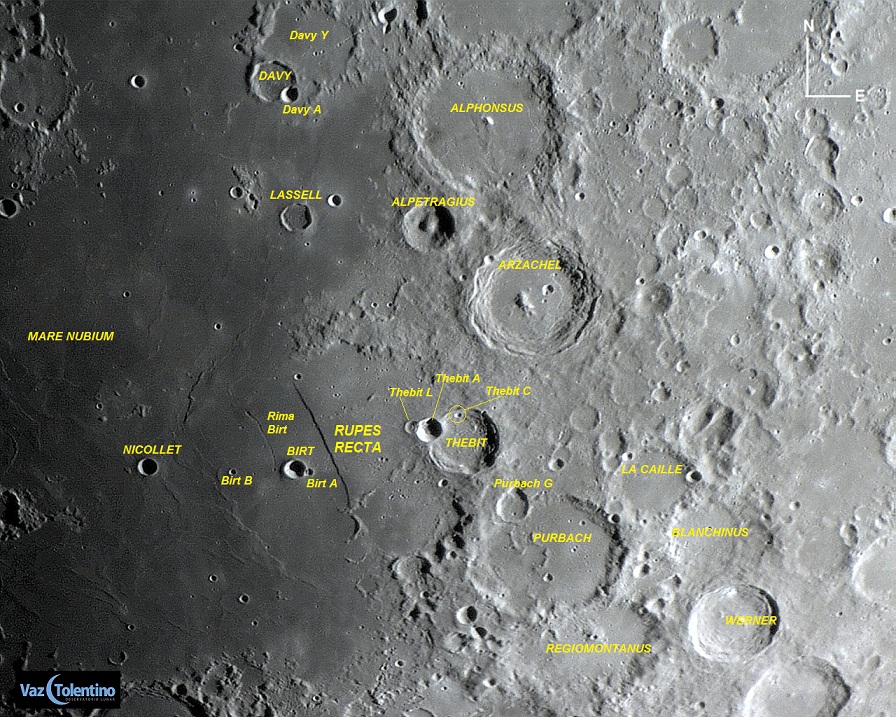Do lado leste de Rupes Recta está a cratera Thebit (diâmetro: 56 Km, Lat: 22.0º S Long: 4.0º W), com a menor Thebit A (diâmetro: 20 Km) sobre sua parede do lado noroeste. Esta cratera menor por sua vez, hospeda a ainda menor Thebit L (diâmetro: 12 Km) em sua borda também noroeste.