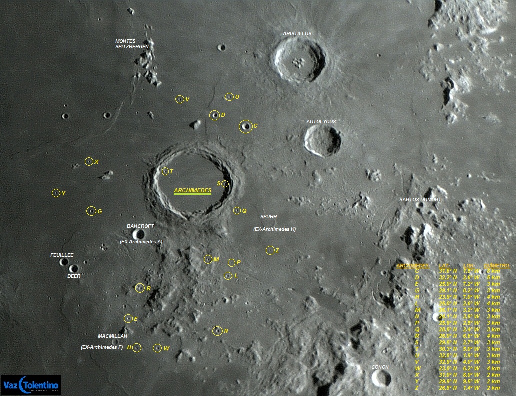 A nordeste de Archimedes encontra-se a cratera de impacto Aristillus (diâmetro: 56 Km, Lat: 33.9º N Lon: 1.2º E), com suas paredes internas que desabaram e formaram degraus (walls in terraces) ou curvas de nível, piso interno plano, 3.6 Km de profundidade e 3 belas montanhas centrais com 900m de altura. As bordas externas que circundam a cratera formam uma espécie de “fortificação” com paredes escarpadas e inclinadas, criadas pelos escombros do impacto.